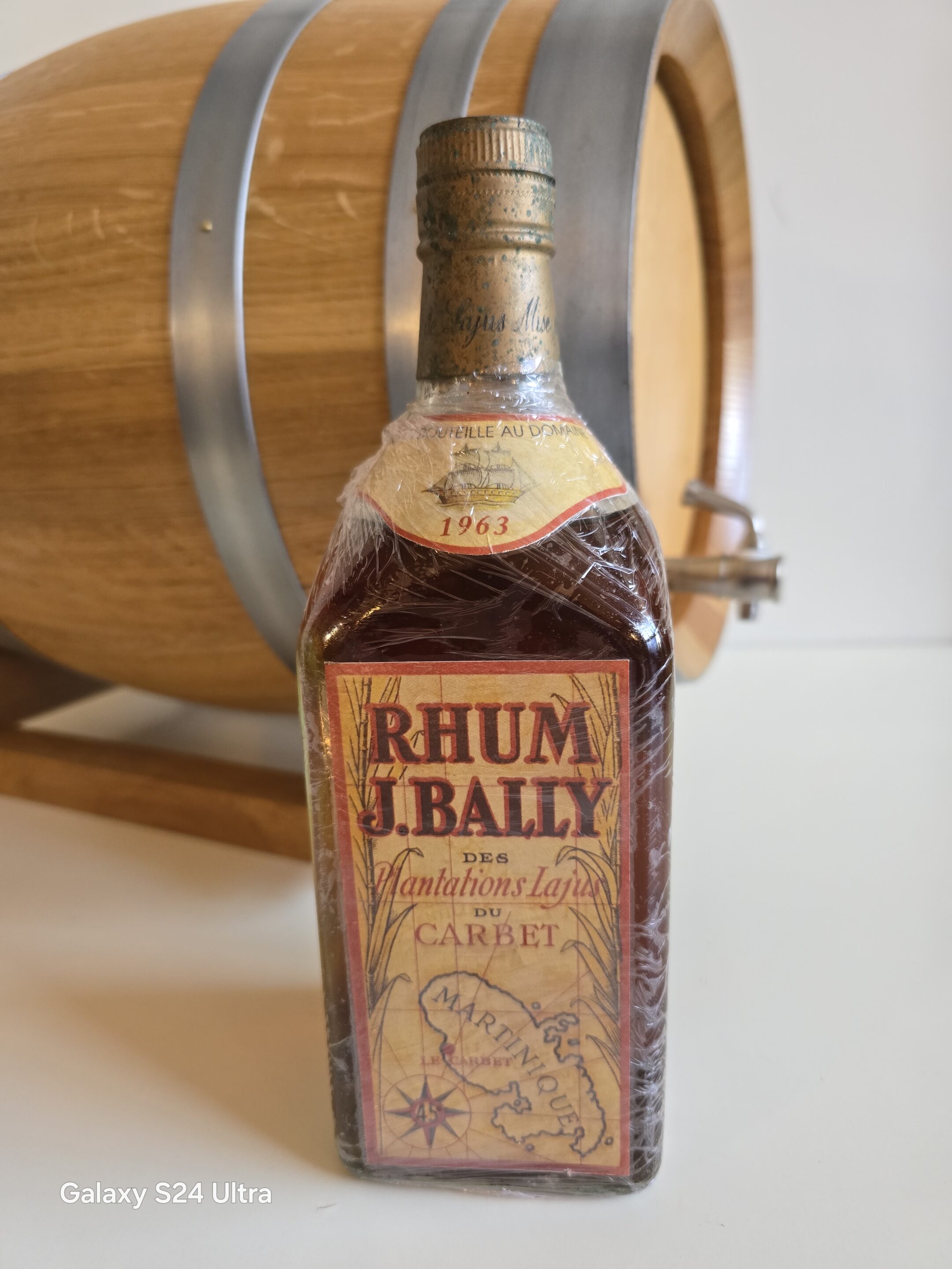 Le rhum vieux BALLY 75 CL 45° millésime 1963 à vieilli pendant de longues années en fûts de chêne dans les chais de la distillerie aux Plantations LAJUS DU CARBET . Un rhum vieux d’exception de la réputée distillerie BALLY en MARTINIQUE . Etiquette abimée et marquée , capsule corrodée.