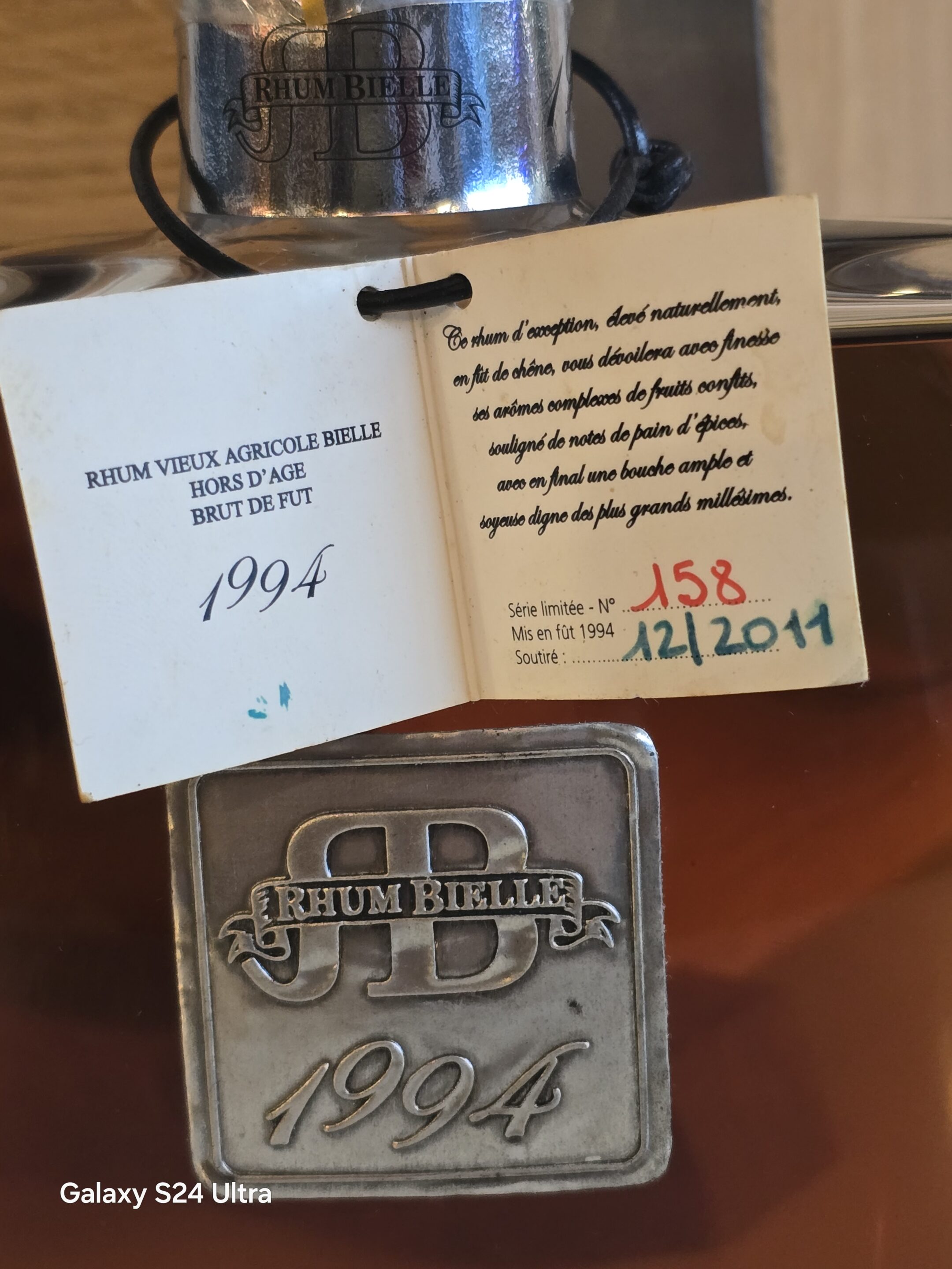 Le rhum vieux BIELLE 70 cl 52° millésime 1994 brut de fût a vieilli pendant 17 longues années en fût de chêne dans les chais de la distillerie puis embouteillé en décembre 2011 dans une somptueuse carafe Majestic .Ces années en fût lui on permis d’avoir une complexité aromatique exceptionnel ,un très grand millésime . Un rhum vieux extraordinaire , qui est devenu très rare de la remarquable distillerie BIELLE sur l’ile de MARIE-GALANTE . Une édition limitée et numérotée à 200 exemplaires . UNIQUE EXEMPLAIRE SANS BOITE . NUMERO 158