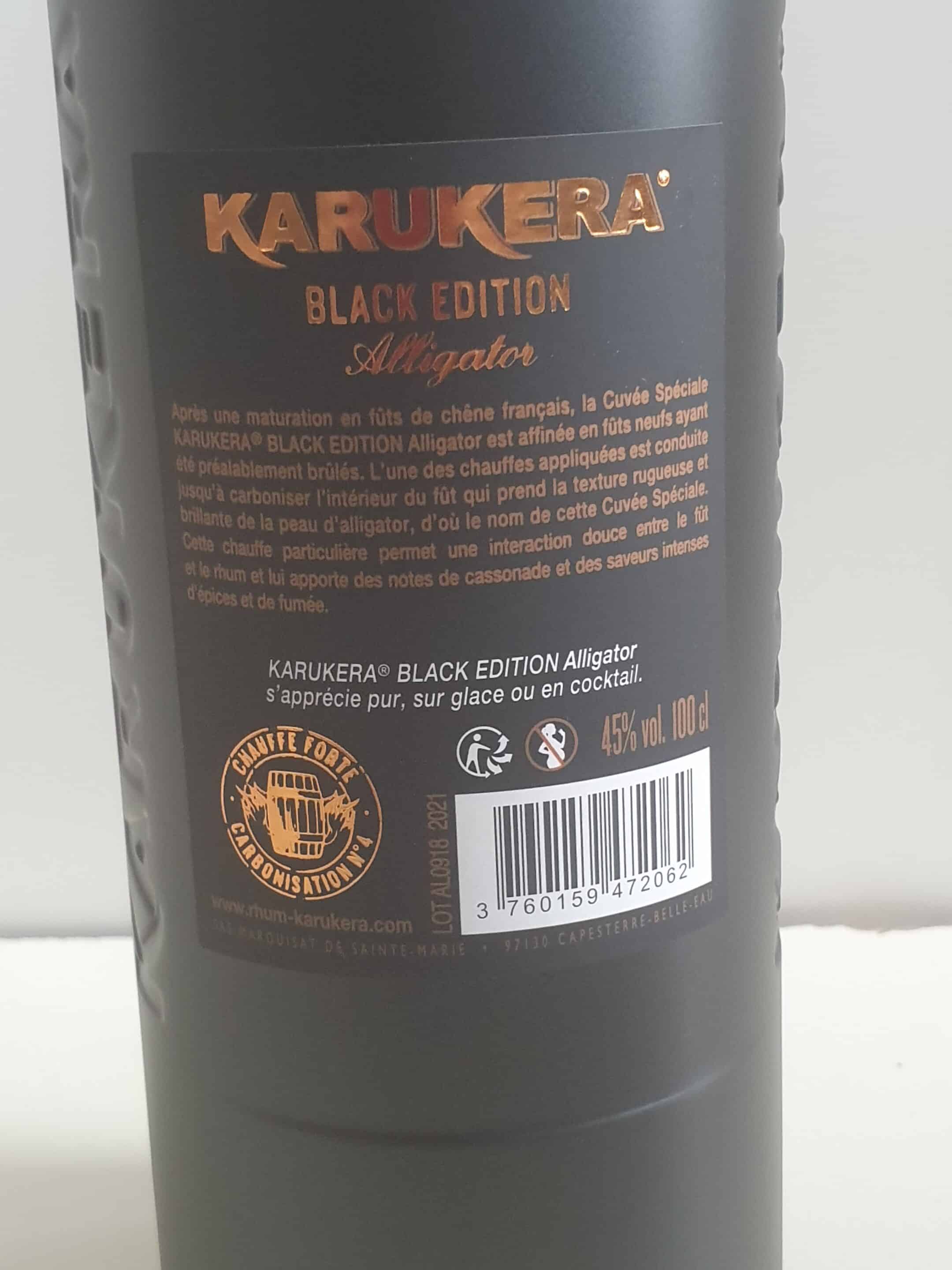 Le rhum vieux KARUKERA ALLIGATOR 1 L 45° a vieilli au moins 4 ans en fût de chêne français ayant subit différentes chauffes notamment une chauffe forte qui modifie la surface du fût intérieur en une surface sombre , rugueuse , brillante ont obtiendra un rhum équilibré avec des notes de caramel , cassonade , d’agrumes , une édition limitée a 3500 bouteilles . Un rhum vieux ALLIGATOR atypique de la réputée rhumerie KARUKERA .