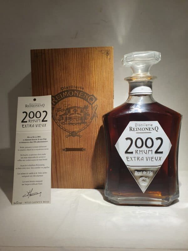 Le rhum vieux REIMONNEQ 70 cl 49° millésime 2002 est un brut de fût et soutiré d’un seul fût Il a été embouteillé à son degré naturel sans réduction , sans filtration à 330 exemplaires .Il a vieilli pendant 16 longues années dans les chais de la réputée distillerie REIMONENQ . Un rhum complexe et gourmand .
